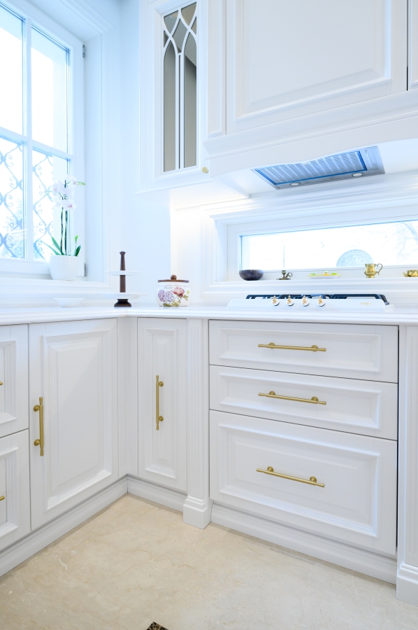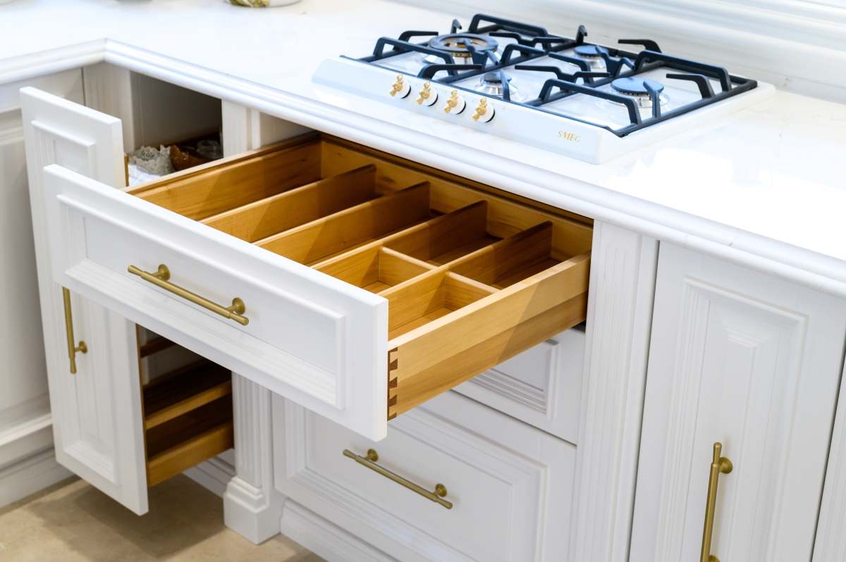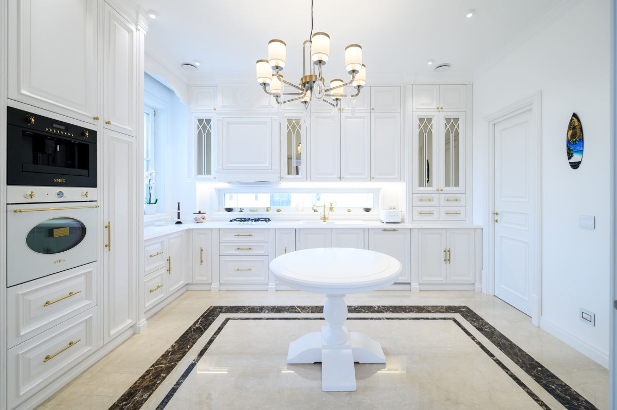 O bucatarie cu adevarat spectaculoasa, cu spatii multiple pentru depozitare si detalii atent alese.